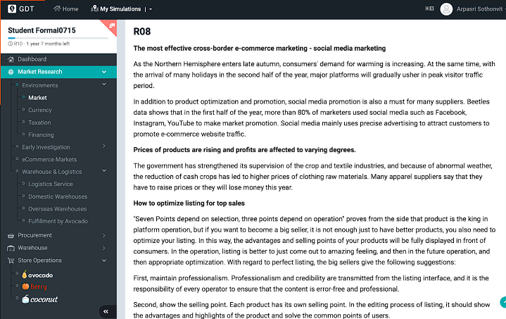 Students will have opportunities to study the changing trends of the fashion retailing industry and how to use different strategies to attract customers, participate in festive e-commerce campaigns, strategize how to compete with their peers and win over the market share. Market research from the simulation also displays tips for the students to focus and warnings to concern in each round. Students will be familiarized and experienced how a cross-border e-commerce trading business functions.